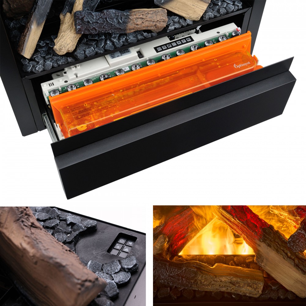 Завдяки вбудованим світлодіодам у муляжі дров створюється ефект тління, який робить камін по-справжньому живим. Світлодіоди м’яко мерехтять, загоряються та згасають, створюючи враження повільно тліючих дров. Цей ефект ідеально доповнює візуалізацію полум’я, підсилюючи відчуття затишку та реалістичності вогню.